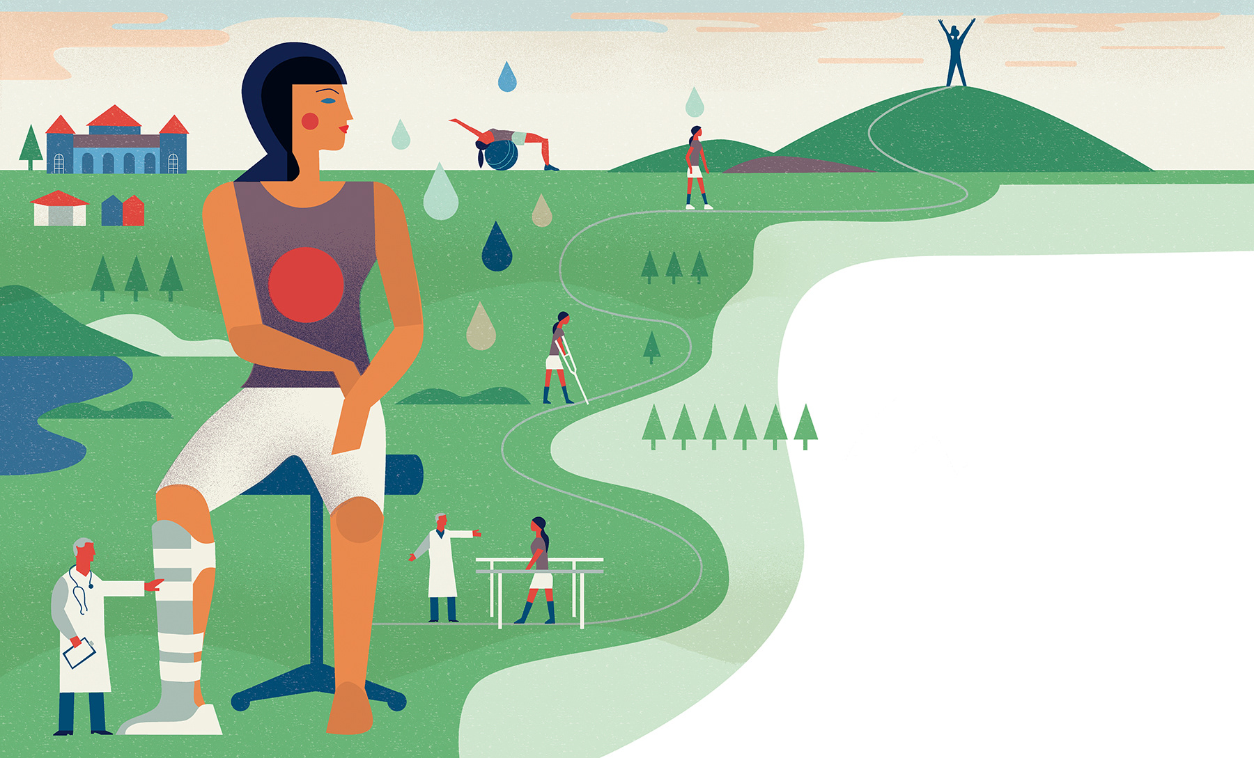 In dieser Illustration eines Aufmacherartikels zeigen wir eine Reha-Patientin. Wir brechen mit Sehgewohnheiten und stellen die Frau in einem außergewöhnlichen Größenverhältnis dar. Unsere Botschaft: Die Patientin steht im Mittelpunkt.